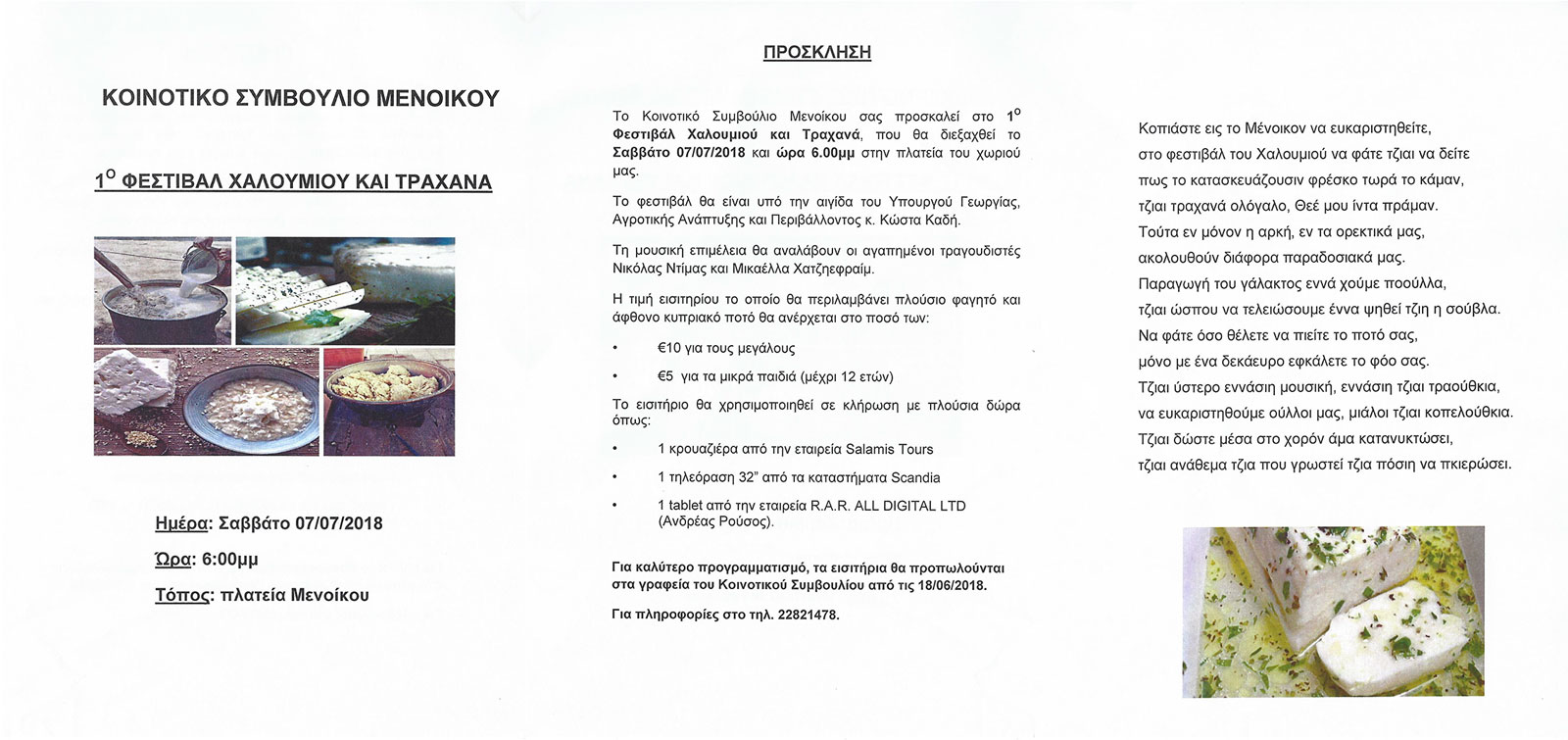 Πρόσκληση 1ου Φεστιβάλ Χαλουμιού και Τραχανά στο Μένοικο (7/7/2018)