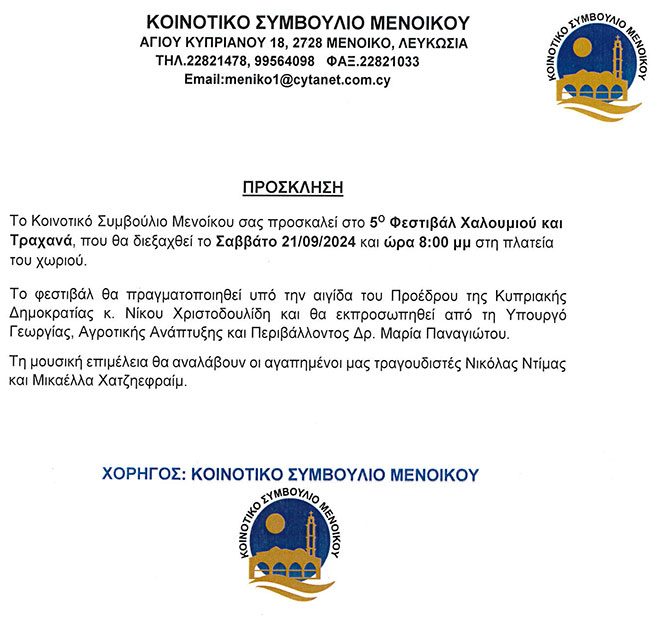 ΚΟΙΝΟΤΙΚΟ ΣΥΜΒΟΥΛΙΟ ΜΕΝΟΙΚΟΥ Αγίου Κυπριανού 18 2728, Μένοικο Λευκωσία Τηλ: 22821478 Φαξ: 22821033 Email: [email protected]